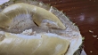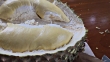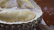 Close up of fresh half-peeled durian fruit on wooden floor, King of Fruits