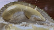 Close-up van verse half-geschild durian fruit op houten vloer - HD Stockvideo