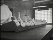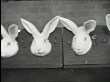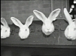 1945 MONTAGE Many New Zealand White Rabbits in box-like holder give injections by nurse / Terre Haute, Indiana, United States