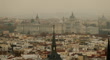 Royal Palace of Madrid and Almudena Cathedral dominating the background, with their intricate architecture and iconic domes. The foreground showcases the densely packed rooftops of Madrid’s historic buildings, punctuated by church spires. The hazy atmosphere creates a soft, muted tone over the city, highlighting the grandeur of the palace and cathedral amid the urban landscape.Madrid, Community of Madrid, Spain - December 01, 2024