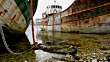 2 of the decaying abandoned wooden trawlers in the harbour at Camaret sur Mer on the Western Brittany coast. Once a busy fishing port it is now a popular Artists town boasting many artisan galleries.