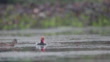 Beautiful adult male Red-crested pochard (Netta rufina), low angle view, in the bright morning floating and forage on the wide swamp with aquatic plant in Chiang Rai Province, northern of Thailand.