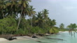 Drone aerial of uninhabited Vattaru Island (Vaavu Atoll) in the Maldives. Camera flies slowly along a beautiful white sand beach