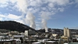 Wide angle; Pan right; Mount Usu after an intensive eruption: Smoke continues to rise from the volcano: Neighboring Lake Toya hot spring resort covered in ashes and snow.