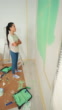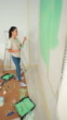 Woman disappointed by the texture and shade of the new paint applied to the wall. She is thinking to give up. Vertical scene in slow motion.
