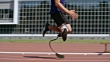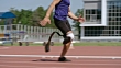 Tracking shot of amputee runner with prosthetic leg sprinting on track in slow motion, coach timing his sprint