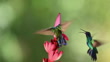Andean Emerald and Sparkling Violetear hummingbird feeding in banana flower. - 4K Stockvideo