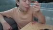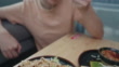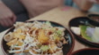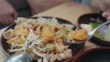 Asian young adults order delivery food and eat mixed salad with fried tofu at home. - 4K Stockvideo