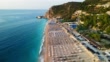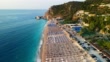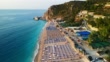 Amazing coast with beautiful beach with parasols in a row and small village around on Ionian sea. Kathisma beach, Lefkada island, Greece