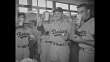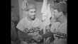 Brooklyn Dodgers players walking into locker room after defeating the Milwaukee Braves at County Stadium in Milwaukee to win the National League Championship , shaking hands / Roy Campanella shaking hands with Harry "Cookie" Lavagetto, winks at camera / players eating and drinking / players and coaches celebrating, waving to camera
