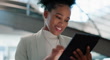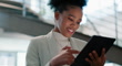 Business, smile and black woman with a tablet, typing and internet for online news and financial blog. African person, accountant and broker with technology and stock market with trading on an app - 4K Stockvideo