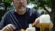 Een Kaukasische man in zijn jaren vijftig met een biertje dips een gekookte kippenvleugel in ranch dressing en eet het buitenshuis - 4K Stockvideo