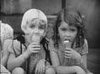 B/W 1931 close up Shirley Jean + Dorothy from Our Gang sitting + eating ice cream cones / feature - Stockvideo