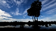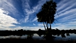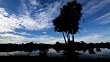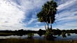 Clouds scud over palm trees, Rufescent tiger heron (Tigrisoma lineatum) feeds at waters edge. Brazil. (Core number: FKAY491X)
