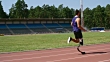 Tracking shot of coach timing amputee runner with prosthetic leg sprinting on track at outdoor stadium in slow motion