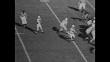 "Cotton Bowl" pennant flutters against sky/cloud backdrop / SMU Mustang Doak Walker throws long pass to Paul Page, who scores touchdown for SMU / two young men in cowboy costumes run to camera guiding a little mustang on a rope just behind them / Penn State Nittany Lion Elwood Petchel throws a pass to Larry Cooney, who scores for Penn State / smiling spectators in stands / SMU kicks from own goal, Petchel returns ball / Penn State's Wallace Triplett, the first African-American to play in the Cotton Bowl Classic, catches pass from Petchel for tying touchdown