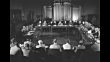 Delegates seated at table / delegates at tables, others seated behind / various shots closer view delegates including US Deputy Secretary of State Edward Stettinius and Secretary of State Cordell Hull / delegates, most military / four delegates at table / delegates including Admiral Percy Noble and Sir Alexander Cadogan (wearing eyeglasses); Cadogan hands paper to Noble / Stettinius with State Department official Leo Pasvolsky and US diplomat Joseph Grew, the latter two holding pipes / pan Andrei Gromyko and the Soviet delegation / delegates / delegates, some clapping / group of photographers in middle of delegates at tables / VS delegates at tables, with VO of conversations, some in Russian / MS delegates, some military / delegates / delegates seated in room; they all stand and start to leave / delegates seated with few in process of sitting; pan delegates; VO gavel bangs, bringing session to order / Note: exact day not known