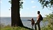 Father and daughter looking at scenic view of lake and pointing - HD Stockvideo