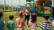Happy children practices the balance equipment before morning exercise class at an international school.