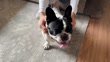 Latin American woman happy enjoying and petting her pet French Bulldog dog in the countryside, friendship between pets and human concept of country way of life..