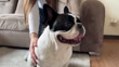 Latin American woman happy enjoying and petting her pet French Bulldog dog in the countryside, friendship between pets and human concept of country way of life..