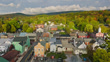 Aerial establishing shot of the town of Boonsboro, Maryland, taken by a drone flying forward on a Fall afternoon.