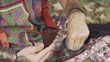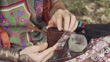 Close-up of a man with tattoos wearing indigenous clothing loading a traditional pipe with tobacco