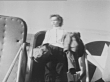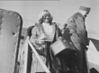 Jan Sterling and Paul Douglas lead group of celebrities deplaning in Seoul as they arrive for a USO performance there during the Korean War; United States Air Force insignia is on plane behind them / group of soldiers on airfield / brunette woman walks down airstairs, followed by Keenan Wynn / Debbie Reynolds, wearing oversized boots, stands at top of airstairs with coat in arms and small duffel bag / Virginia Hall carries train case down airstairs past a man on the airstairs who watches her / Hall stands on airfield; Wynn passes by her, carrying garment bag over his shoulder / from Greatest Headlines of the Century / Note: [exact dates not known]