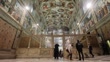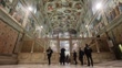 VATICAN CITY, VATICAN - FEBRUARY 28: Journalists look at the Sistine Chapel as the 'Last Judgement' is covered with a replica of the fresco to protect the scaffoldings of the restoration of Michelangelo's masterpiece on February 28, 2026 in Vatican City, Vatican. The Last Judgement is undergoing an extraordinary cleaning maintenance. (Footage by Origlia Video/Getty Images)