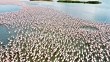 Aerial view of a flamboyance of lesser Flamingoes gathered on a lake in South Africa. The birds feed on algae, brine shrimps and aquatic plants