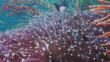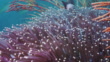 The polyps of this Magnificent sea Anemone (Heteractis magnifica) coral are swaying in the waters of the Andaman sea, Thailand. Surrounded by red Gorgonia sea fan corals.