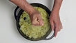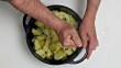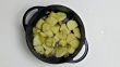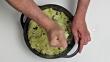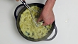 Mashing pressure cooked mix of chopped potatoes and leeks. Human hand with masher. Black cast iron casserole.