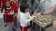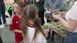 Close up Arsenal girls youth team collecting bowls of their plant based lunch from staff