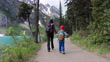 Mother and Son Walking Hands in hands on Lake Louise Lakeshore Trail in the Morning, Alberta, Canada. There is no people on the trail due to Covid-19, Coronavirus Pandemic year.