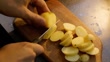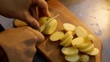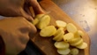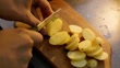 A person carefully slices a raw potato into thin rounds on a wooden cutting board, preparing it for cooking.