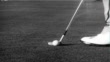 WS BEHIND Professional golfer USA Walter Burkemo (1918-1986) taking five iron from bag, preparing to hit ball onto green, hitting, ball rolling on green and wedging between hole flag & cup rim. WS SLO MO ACROSS FROM Walter hitting ball / LA WS Professional golfer USA Walter Burkemo putting on green, LA TU MS Walter putting, MS Walter's hands holding club, LA MS Putter behind golf ball, putting ball forward down frame. SLO MO MS Walter putting / CU male hand in dark turning USA off film projector.