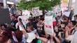 INDIANAPOLIS, INDIANA - JUNE 11: (EDITORS NOTE: audio/music licensing is not included.) Protesters dance while holding sings and waving flags outside Gainbridge Fieldhouse during Game 3 of the NBA Finals to oppose recent ICE immigration raids on June 11, 2025 in Indianapolis, Indiana. The protest remained peaceful as police maintained a visible presence in the area. (Footage by Jeremy Hogan/Getty Images)