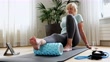 Getting fit concept. Senior woman doing Trigger Point Therapy Legs Massage with Foam Roller in the living room.