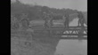 Soldiers running forward down slope, tilt up to George VI watching / artillery piece / soldiers manning artillery piece / VS soldiers loading shell into artillery piece / two shots of soldier aiming through viewfinder / three shots of soldiers firing artillery piece / soldiers lifting steel girder for bridge as George watches / soldiers walking across makeshift bridge over canal / soldiers rowing raft under bridge / George and officers walking across bridge / Note: exact month/day not known