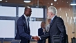 Wide handheld shot of a team of business people lead by a senior businessman with a grey beard entering the meeting room and shaking hands with the other team. Shot in Slovenia.