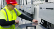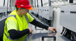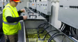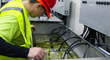 A technician working on an immersion cooling system in a data center for cryptocurrency mining, cloud services and AI computing in a large, temperature controlled warehouse in a remote location in Stutsman County, North Dakota. The server is submerged in a tank of a non-conductive fluid that draws away heat more efficiently than air, which lowers the energy and water consumption of the facility.