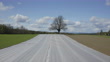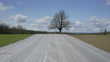 Flying over field covered in white fabric towards an elm tree on top of a hill