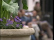 Flowers PULL FOCUS tourists sitting on bench