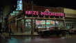 WIDE ANGLE OF KATZ'S DELICATESSEN IN SOHO OR LOWER EAST SIDE. RESTAURANT. STREETS WET. CARS PARKED ON STREET. PEDESTRIANS WALK DOWN SIDEWALK. NEON SIGNS.