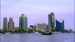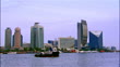 Wide shot Ship floating across Dubai Creek in front of National Bank of Dubai Building/ Dubai, United Arab Emirates - HD Stockvideo