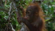 CU PAN with baby Orangutan climbing through low branches - 4K Stockvideo