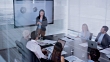 Wide locked down shot of a Caucasian woman giving a presentation to colleagues sitting at the table in the conference room. She explains the graphs on the screen in the background. Shot through glass. Shot in Slovenia.