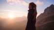 Woman hiker in mountainside standing on top of mountain overlooking valley, and admiring the view at sunset