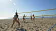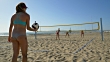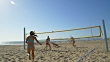 Women players play beach volleyball and a player jump serves serving the ball. - Slow Motion - 4K Stockvideo