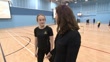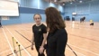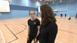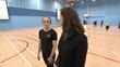 Neave McGhee (Pupil and athlete - at school with British heptathlete Katarina Johnson-Thompson attended as a girl) along through gym with reporter